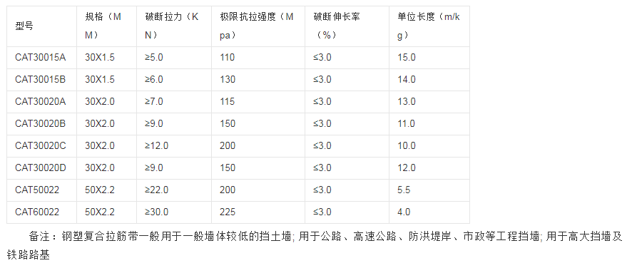 鋼塑復(fù)合拉筋帶是指選用特制微型高強鍍鋅鐵絲、外裹抗老化耐酸堿聚乙烯樹脂復(fù)合而成的剛性材料和柔性材料的綜合性產(chǎn)品,又叫鋼塑復(fù)合加筋帶,其主要受力元件為鋼絲,蠕變量很小。
