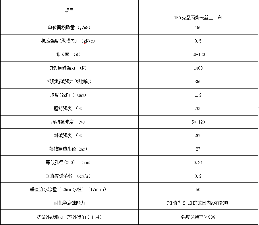 (2)化學(xué)穩(wěn)定性好。聚丙烯具有優(yōu)良的耐酸耐堿性,特別是耐堿性能優(yōu)于聚酯。聚酯土工布?jí)A性條件下或大量水分存在時(shí)易發(fā)生不可逆的水解作用,使材料性能下降甚至完全喪失,尤其不適用于與水泥、石灰、鹽堿地等堿性界面直接接觸的部位,而聚丙烯土工布則完全適用上述環(huán)境,且不會(huì)對(duì)環(huán)境造成污染。