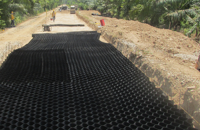 Георешётка ограничивает сдвиговые деформации и укрепляет насыпной грунт, создавая единую структурную массу, которая выдерживает большое давление. Конструкция объемной георешётки проста и технологична. Размеры ячейки, её высота, выбираются в зависимости от расчётной нагрузки. В качестве материала-заполнителя может быт использован местный грунт, щебень, песчано-гравийная смесь, бетон и другие материалы.